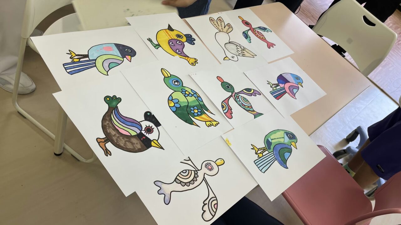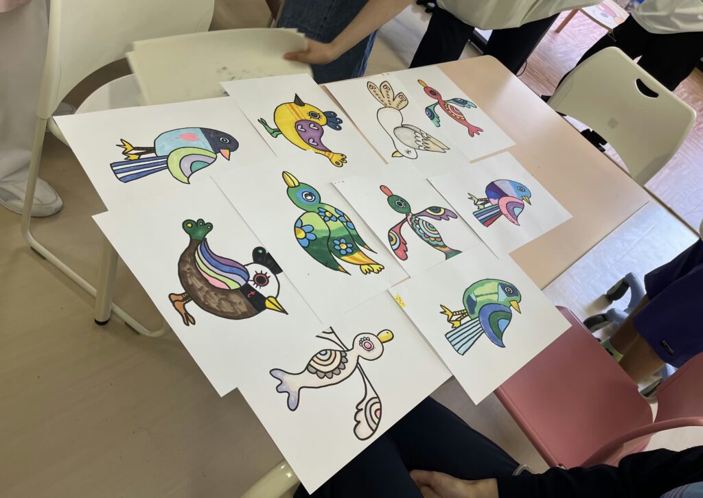 まず色付け用のコピックの色の多さと美しさにみんなの目は釘づけ。すぐに夢中になって取り組んでいました。いろいろな種類の鳥のステッカー下絵が出来上がりました。1つとして同じものはない!自分のイニシャルを入れてもよし、独自のデザインを凝ってもよし。それはそれは賑やかなワークショップでした。