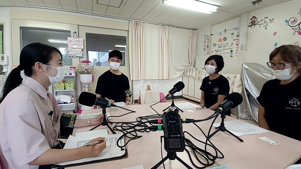 写真は前回病棟プレイルームにて、日大芸術学部放送学科の学生さんが普段の活動や今回のプロジェクトへの想いをインタビューしてくださった風景です。